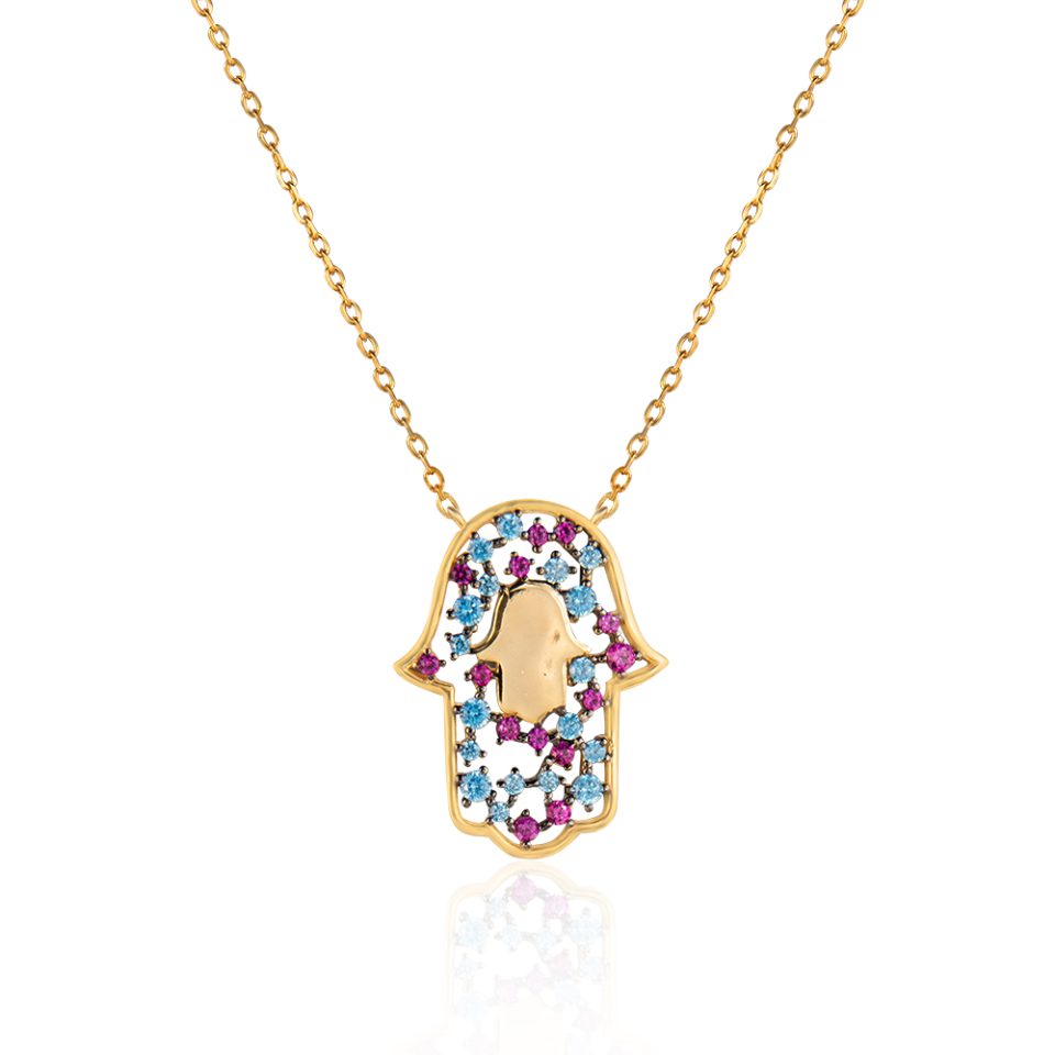 Golden hand with distinctive ruby and aquamarine stones silver 925