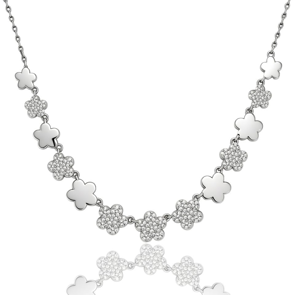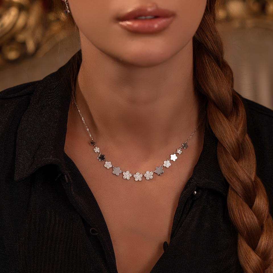 A necklace of tightly woven, polished, and studded flowers in 925 sterling silver.