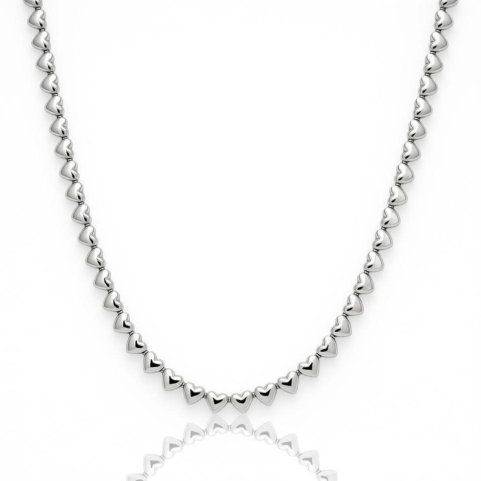 A necklace of interconnected hearts made entirely of 925 sterling silver.