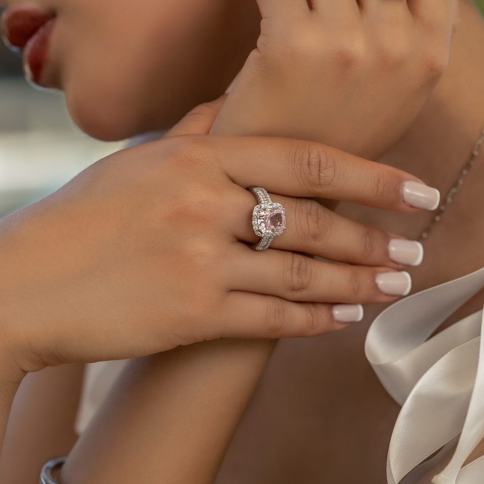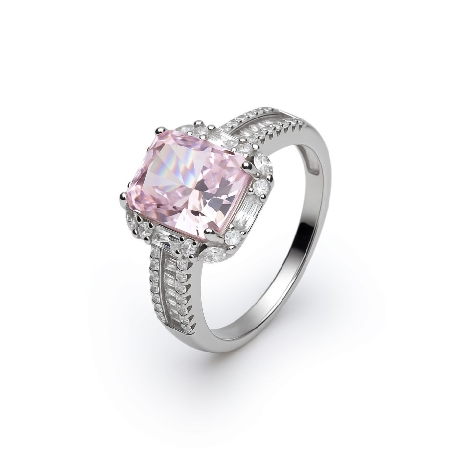 A ring with a shiny rose quartz stone and sparkling zircon and baguette stones Silver 925