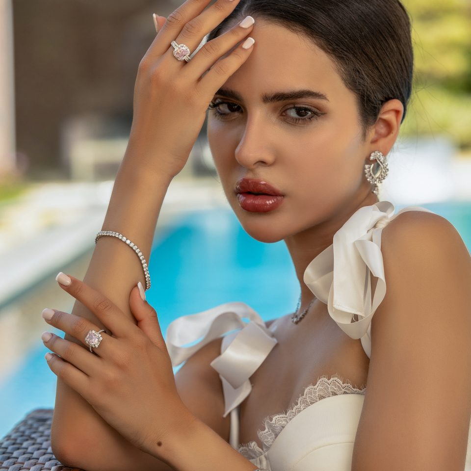 Rose quartz ring with sparkling zircon stones Silver 925